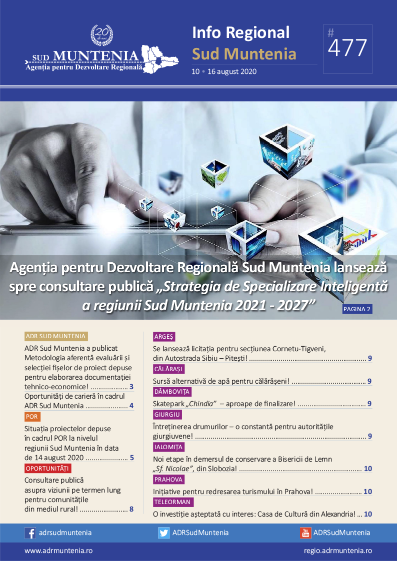 Publicaţia a ajuns la numărul 477 şi poate fi citită pe site-ul nostru la secţiunea Newsletter, link: https://www.adrmuntenia.ro/download_file/newsletter/495/info-regional-sud-muntenia-nr-477.pdf