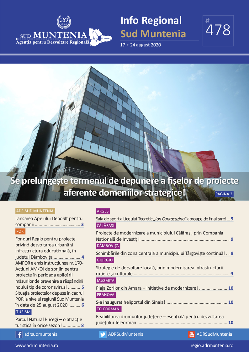 Publicaţia a ajuns la numărul 478 şi poate fi citită pe site-ul nostru la secţiunea Newsletter, link: https://adrmuntenia.ro/download_file/newsletter/496/info-regional-sud-muntenia-nr-478.pdf.