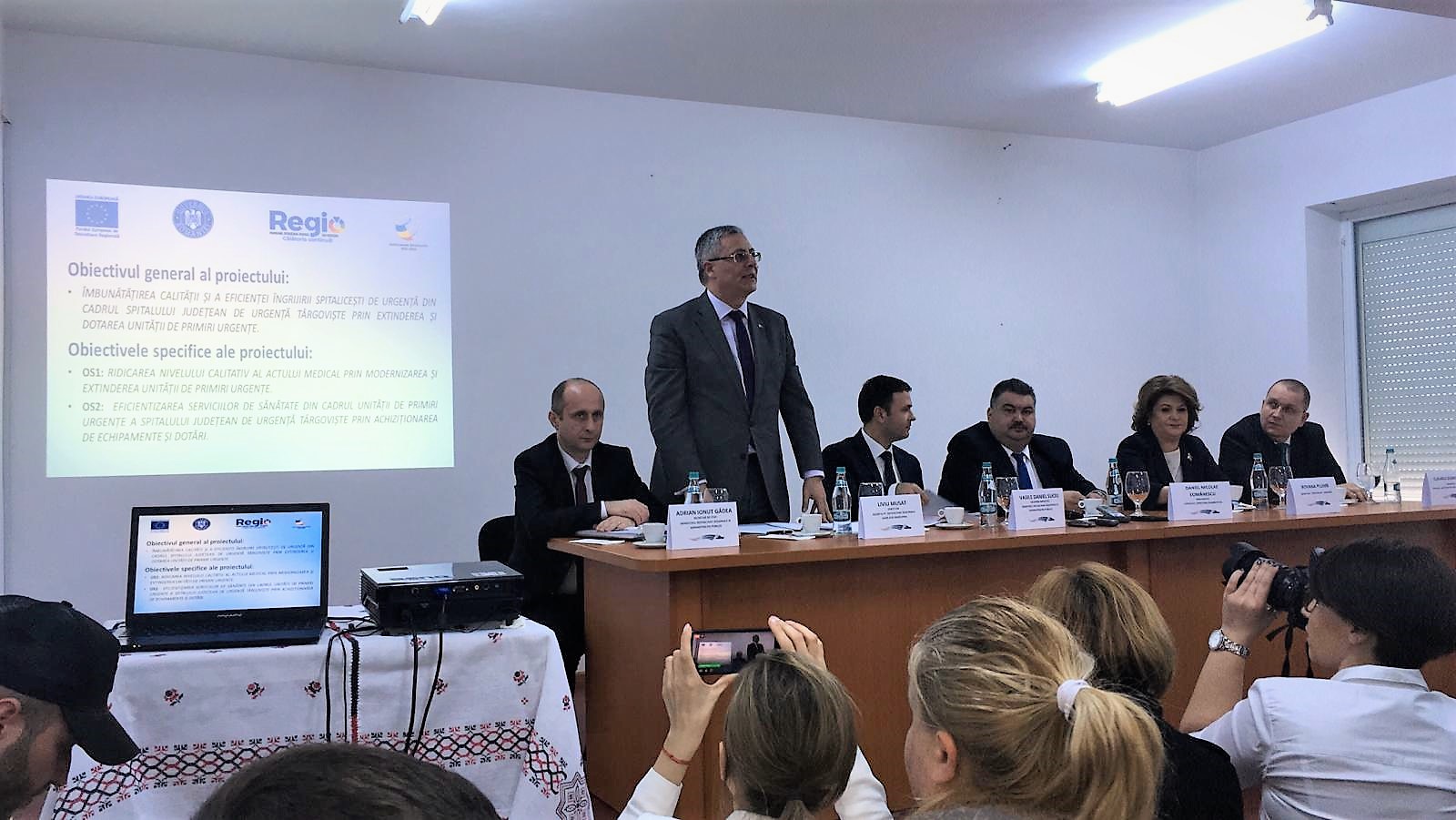 Consiliul Județean Dâmbovița, în calitate de beneficiar, a obținut finanțare nerambursabilă pentru îmbunătățirea infrastructurii sanitare a Spitalului Județean de Urgență Târgoviște, în cadrul Axei prioritare 8, „Dezvoltarea infrastructurii sanitare și sociale”, Prioritatea de investiții 8.1 „Investiții în infrastructurile sanitare și sociale care contribuie la dezvoltarea la nivel național, regional și local, reducând inegalitățile în ceea ce privește starea de sănătate și promovând incluziunea socială prin îmbunătățirea accesului la serviciile sociale, culturale și de recreere, precum și trecerea de la serviciile instituționale la serviciile prestate de comunități”, Obiectivul specific 8.1 „Creșterea accesibilității serviciilor de sănătate, comunitare și a celor de nivel secundar, în special pentru zonele sărace și izolate”, Operațiunea A - Ambulatorii, respectiv Obiectivul specific 8.2 „Îmbunătățirea calității și a eficienței îngrijirii spitalicești de urgență”, Operațiunea B – „Unități de primiri urgențe”.